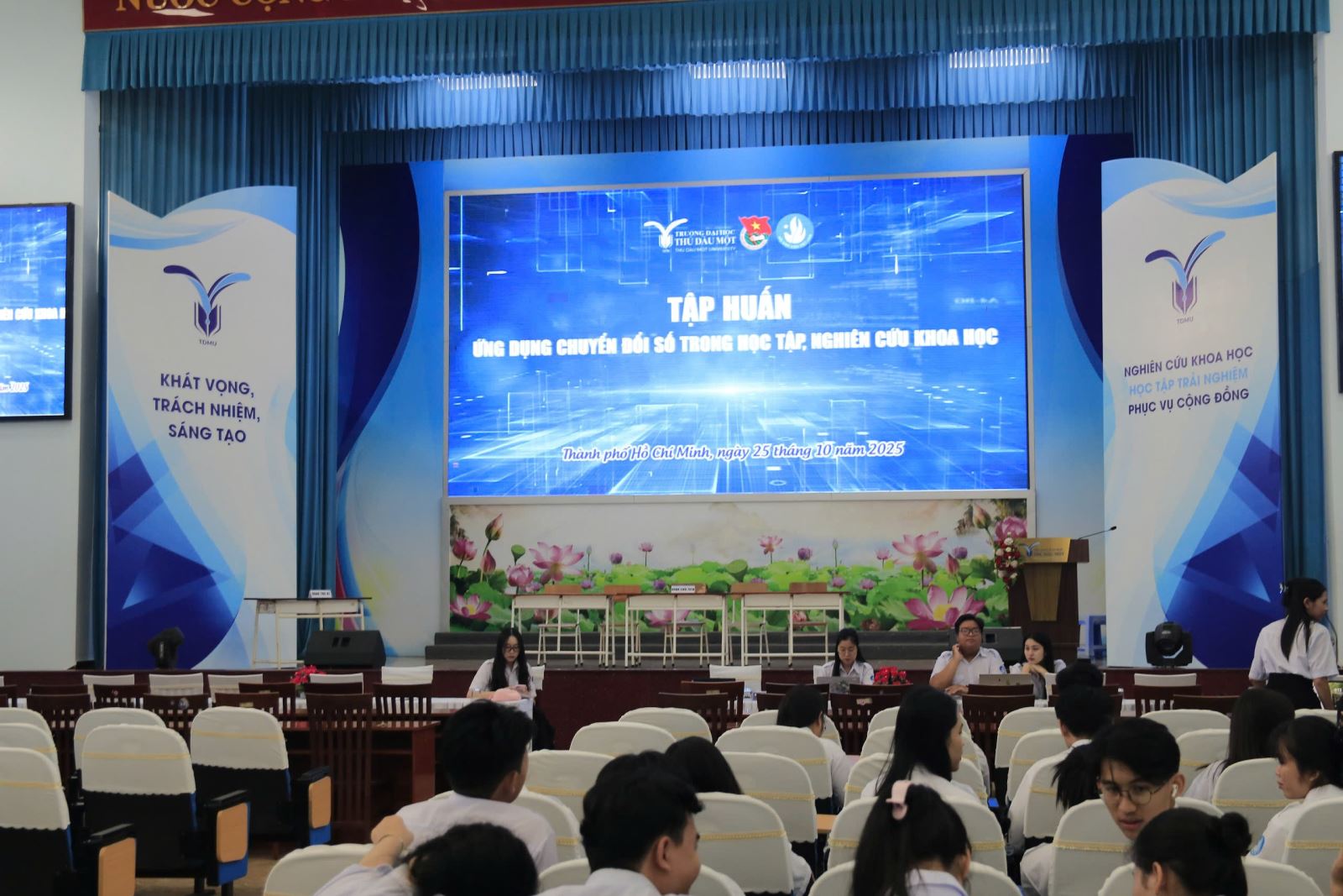 Ngày 25/10/2025, tại Hội trường lớn Trường Đại học Thủ Dầu Một, Hội Sinh viên Trường đã tổ chức buổi tập huấn “Ứng dụng chuyển đổi số trong học tập, nghiên cứu khoa học”. Đây là hoạt động thiết thực chào mừng Tuần lễ “Sinh viên Thành phố Hồ Chí Minh phát triển khoa học, công nghệ, đổi mới sáng tạo và chuyển đổi số”, đồng thời góp phần lan tỏa tinh thần học tập suốt đời, thích ứng với thời đại công nghệ 4.0.
