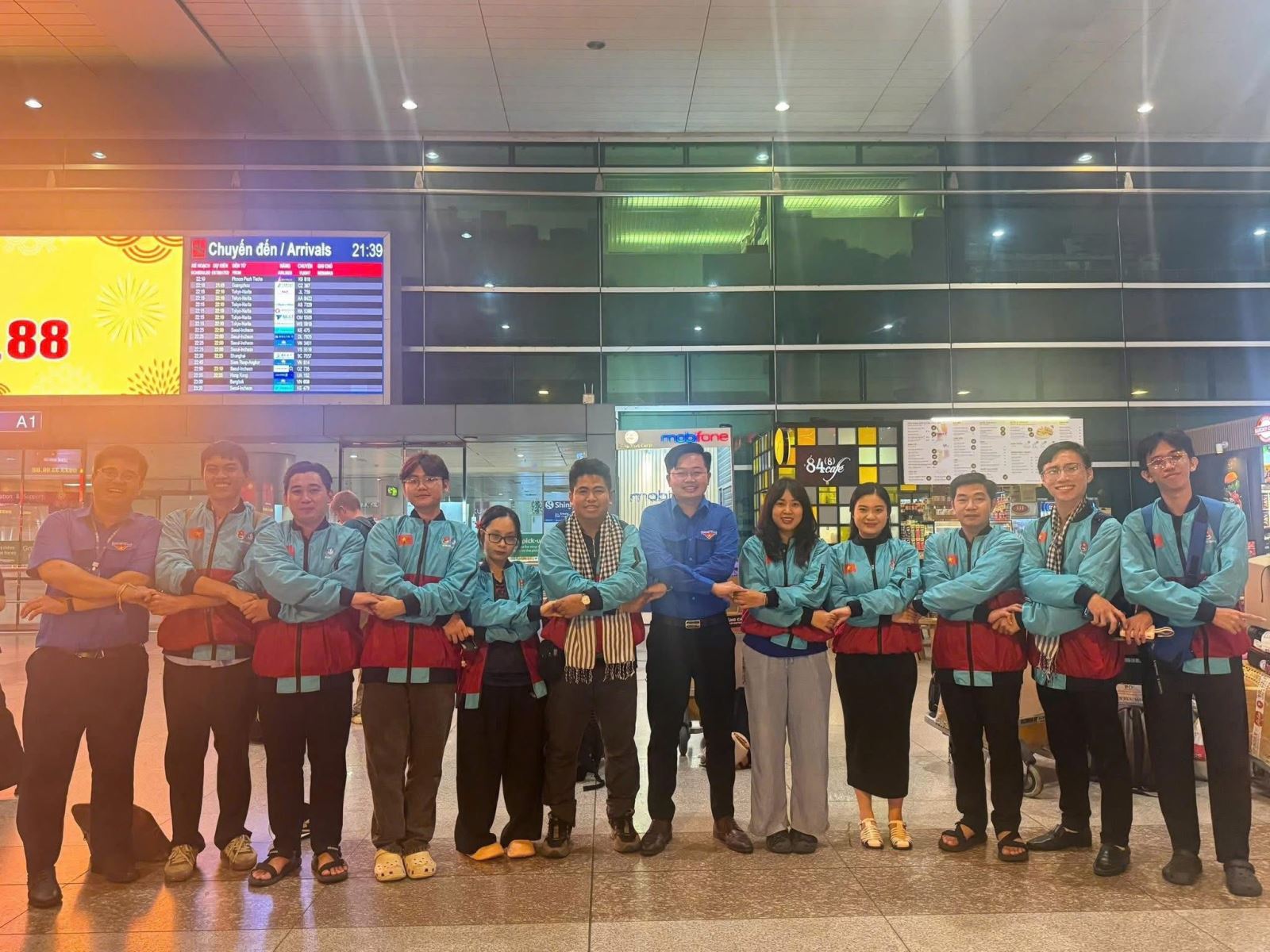 Đoàn đại biểu thanh niên, sinh viên Việt Nam trở về sau hành trình YSS – ASEAN Students Volunteer Mission to Sarawak 2025. Tại sân bay Tân Sơn Nhất, các thành viên cùng nắm tay thể hiện tinh thần đoàn kết, khép lại những ngày tình nguyện đầy trải nghiệm, cống hiến và trưởng thành nơi đất nước Malaysia.