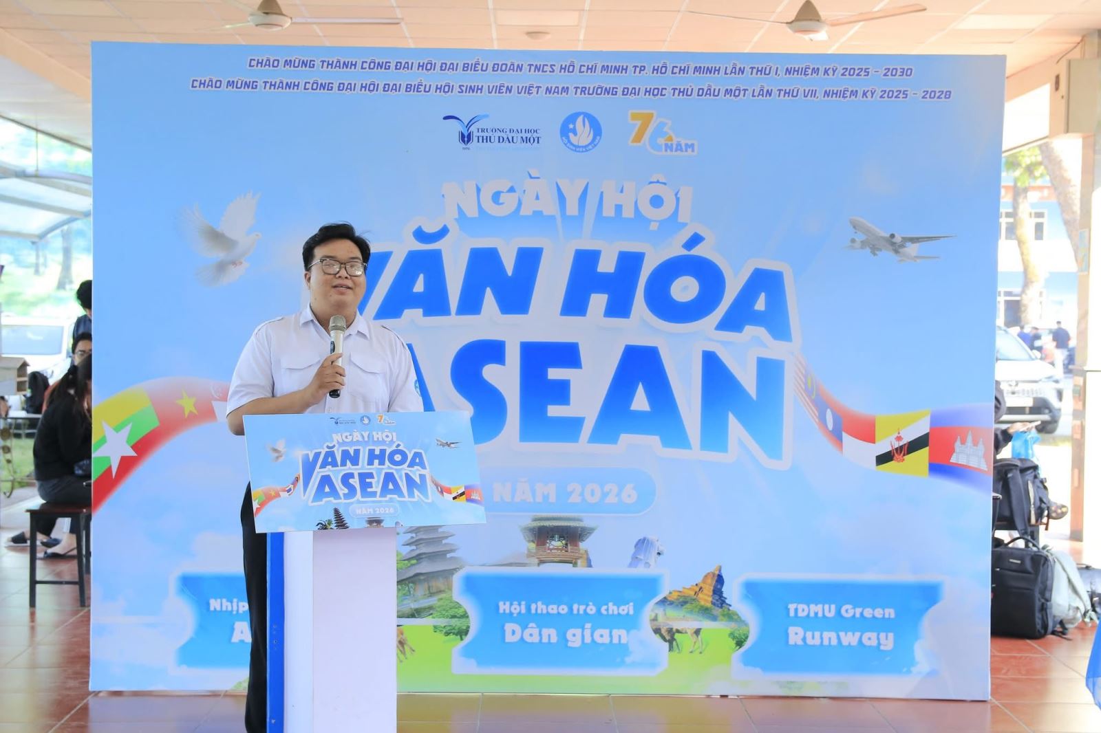 Phát biểu khai mạc Ngày hội “Văn hóa ASEAN 2026”, đ/c Võ Quốc Thắng – Chủ tịch Hội Sinh viên Trường Đại học Thủ Dầu Một nhấn mạnh: “Cộng đồng ASEAN không chỉ là không gian hợp tác về kinh tế, chính trị mà còn là nơi hội tụ của những giá trị văn hóa đa dạng, giàu bản sắc. Thông qua Ngày hội ‘Văn hóa ASEAN 2026’, Hội Sinh viên Trường mong muốn tạo dựng môi trường giao lưu, trải nghiệm thiết thực để sinh viên hiểu hơn về văn hóa các quốc gia trong khu vực, từ đó bồi dưỡng tinh thần hội nhập, tôn trọng sự khác biệt và phát huy bản sắc văn hóa dân tộc trong thời đại toàn cầu hóa.”